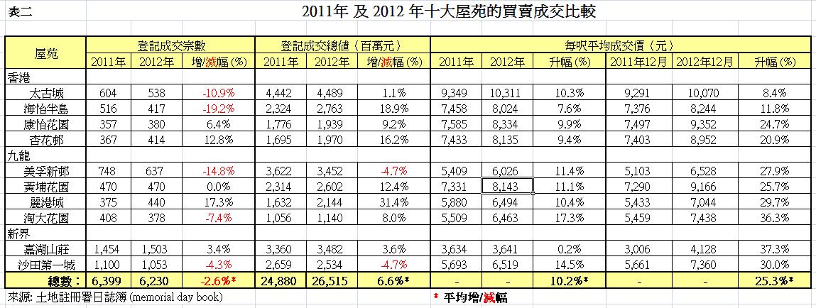 比較2012年12月及2011年12月的平均呎價,太古城、康怡花園、黃埔花園、杏花邨及海怡半島分別以$10,070、$9,352、$9,166、$8,952及$8,244位居前五名;以成交呎價升幅論,嘉湖山莊、淘大花園、沙田第一城、麗港城及美孚新邨分別以37.3%、36.3%、30%、29.7%及27.9%位列前五名。十個屋苑去年12月平均呎價較2011年同期升幅為25.3%。