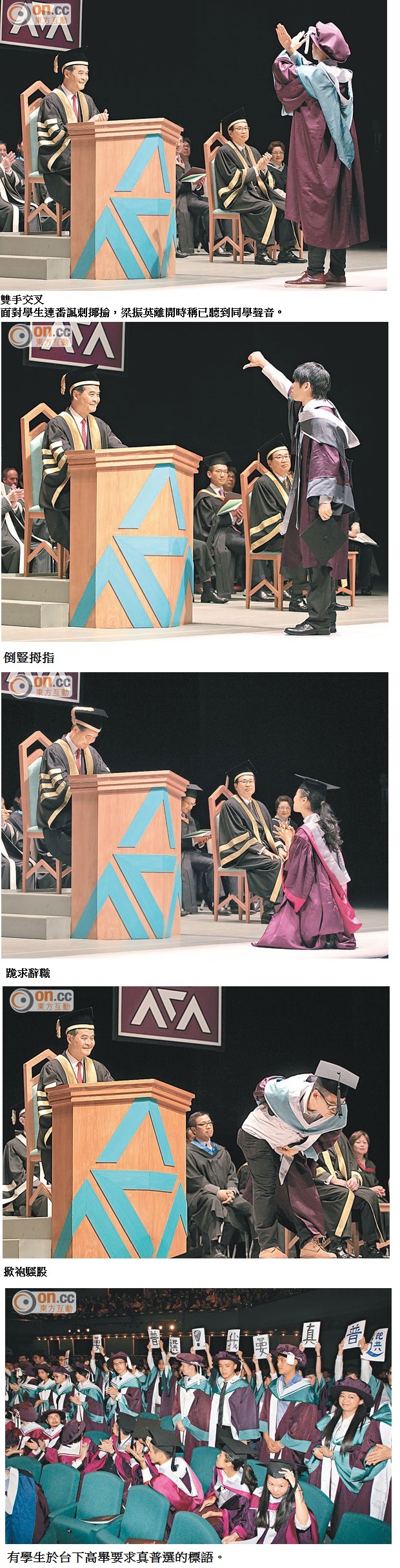 【6月28日太陽報專訊】民望低處未算低的特首梁振英,昨以校監身份主持香港演藝學院畢業禮時,被畢業生以創新手法諷刺,包括背向行禮、當梁隱形,當面做出「交叉」、「下台」以至粗口手勢等,亦有人向梁遞上平反六四紙條及高呼爭取普選口號,在台下集體高舉「我要真普選」橫額,梁全程強顏歡笑。