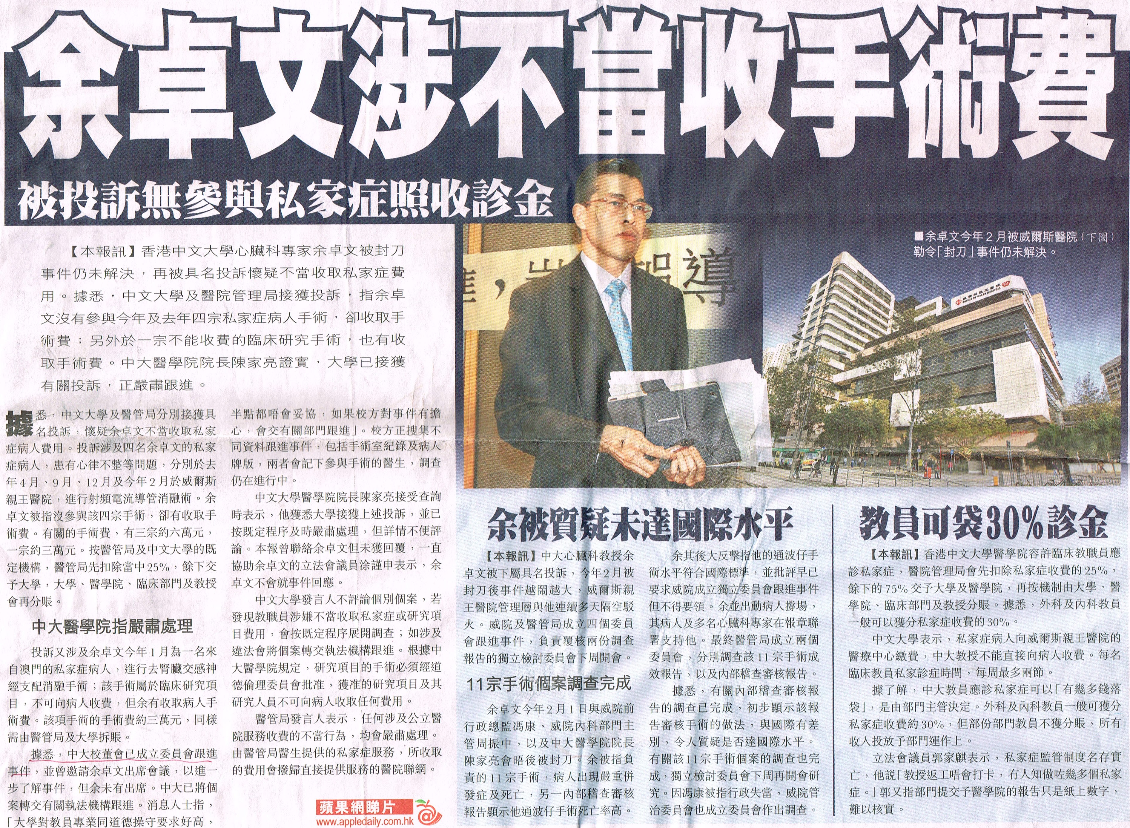 蘋果日報12月13日以《余卓文涉不當收手術費》一文,報導香港中文大學心臟科專家余卓文被封刀事件以來的另一事件。