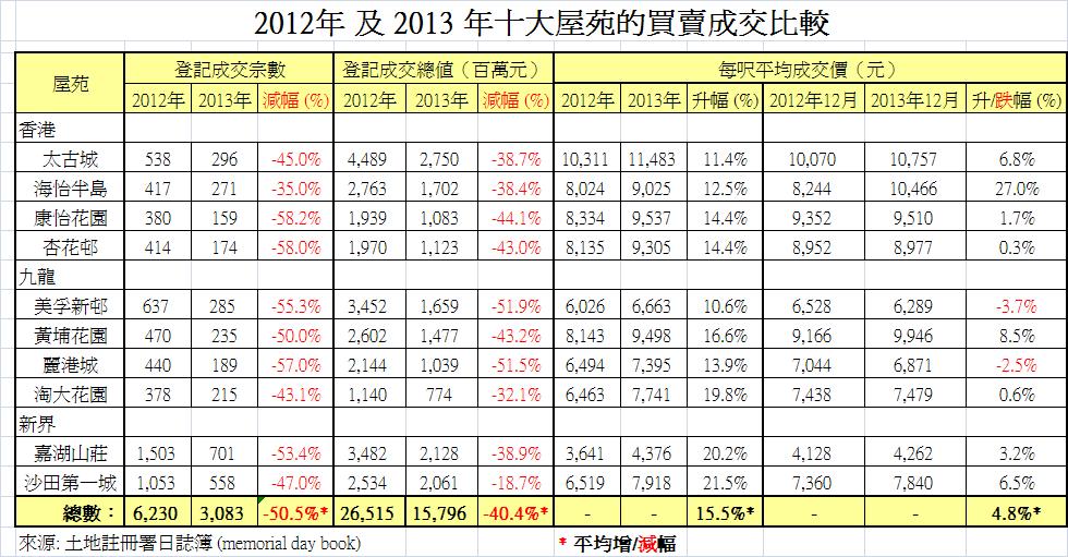 為了了解中下價屋苑樓價在2013年的表現,我將全港最具規模的十個屋邨(各有4,800個以上住宅單位,但不列入愉景灣)的買賣成交資料加以整理和統計,結果如附表。