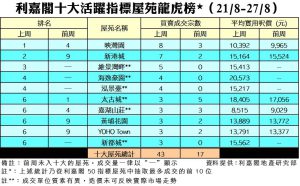 利嘉閣地產董事陳大偉表示,二手市場靜極思動,在個別業主願意略為減價下,刺激過去一周二手交投略為轉活。綜合利嘉閣地產分行數據所得,全港十大活躍指標屋苑在上周(21/8–27/8)共錄得43宗買賣個案,較前周的17宗按周增加1.53倍,交投在低基數下明顯好轉,平均每個屋苑錄逾4宗成交。