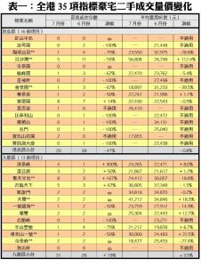 利嘉閣地產董事張偉文指出,七月份正值暑假開鑼,不少買家外遊度假,加上市場盤源持續緊絀,令指標豪宅成交量連續兩個月錄得回落。根據利嘉閣地產數據所得,七月份全港35項指標豪宅物業共錄64宗買賣個案,較六月份的81宗進一步減少24%,創今年一月以後的六個月新低,亦為今年以來交投量次低的月份。