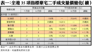 二手指標豪宅交投量接連回落,惟豪宅樓價走勢仍然堅挺,七月份35項指標豪宅物業的加權平均樓價指數報177.64點(07年12月為100點),按月上升1.7%,連續六個月創下有紀錄以來新高;今年首七個月指標豪宅樓價則累計升近6.8%。