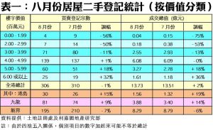 按樓價作分析,在六個價格分類之中,八月份共有3個分類買賣登記量錄得跌幅,當中包括價值200萬元以下、200萬元至299萬元及300萬元至399萬元組別,期內分別錄得4、7及71宗登記,按月分別大減56%、50%及11%。至於分區方面,只有新界區二手居屋買賣登記報跌,期內共錄195宗登記,按月減少7%;而九龍及港島區分別錄得81宗及30宗,按月各自增加9%及15%。