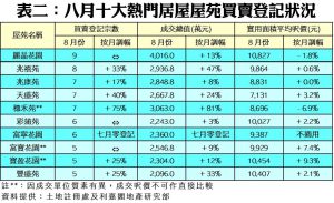 按屋苑細分,上月以九龍灣麗晶花園的成交登記宗數最多,錄得9宗登記,按月持平,而屋苑期內成交總值為4,016萬元、按月上升13%。緊隨其後為屯門兆禧苑,上月錄得8宗買賣登記,涉及金額2,937萬元,較七月分別增加33%及47%。