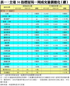 至於,港島區8個指標屋苑上周累錄9宗交投,按周增加50%或3宗,其中龍頭屋苑太古城錄得2宗買賣,較前周的3宗減少33%;藍灣半島則有1宗成交,與前周錄得的數字相同;而康怡花園、南豐新村、鯉景灣及嘉亨灣均突破前周「捧蛋」的淡況,上周分別有1宗至3宗買賣交投。另外,在全港50個指標屋苑當中,上周共有13個屋苑錄得「零成交」,較前周的16個減少近19%,當中港島區及新界區各2個及3個,九龍區則佔8個(詳見表一)。