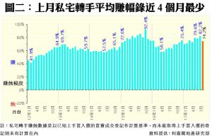 二手市場交投淡靜,樓價出現乾升,並在高位表現反覆,部分業主面對新盤競爭,願意略為加大議價空間,令之前業主強勢主導的情況稍見紓緩。數據顯示,八月份每宗私宅轉手個案平均賺幅為74.2%,為最近4個月以來的低位,較七月份的82.2%顯著回落8個百分點(見圖二),反映近期樓價在高位拉鋸,買賣雙方反覆議價下,業主賺幅有所收窄。八月份,帳面獲利1倍或以上的轉手個案佔整體二手私宅買賣比例達46.1%,共錄得797宗;至於錄得虧損者有20宗,佔比輕微上升至1.2%。