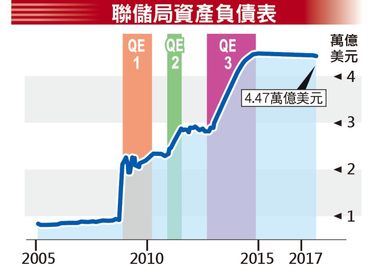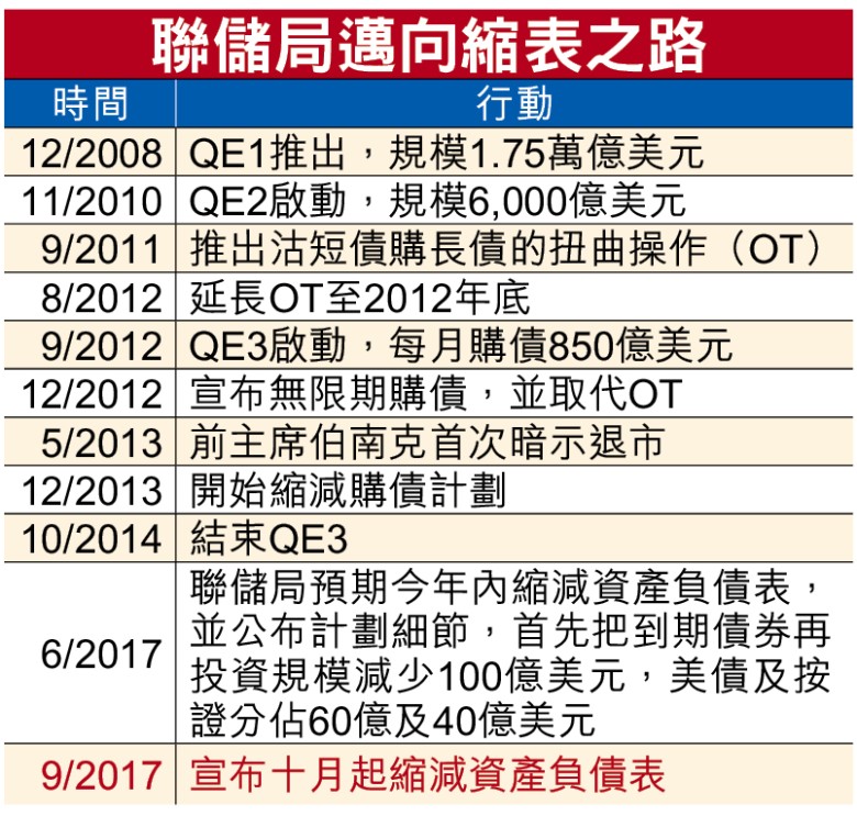 按當局早前披露的縮表計劃,首先將到期債券再投資規模每月減少100億美元,當中美債及按證分別佔60億及40億美元,之後逐季以同等幅度遞增,直至每月縮減規模達到500億美元。