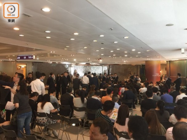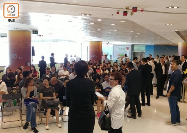 據悉,目前已有約50組買家到場登記,連同地產代理估計共有逾百人等候揀樓,場面熱鬧發展商正在進行抽籤,隨即將進行銷售。