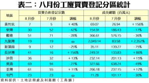 就本行定期觀察的十個主要工業區作分析,共錄得4區下跌、4區上升及2區持平的情況;當中以長沙灣區錄得的升幅最顯著,區內八月份買賣登記共有41宗,較七月的16宗大升1.56倍,主要受惠投資者拆售區內一工廈同一樓層而錄得18宗登記。此外,葵涌及荃灣區蟬聯榜內活躍登記地區首兩位,分別錄得69宗及61宗買賣登記。