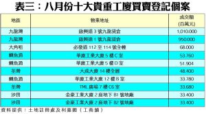 按物業價格類別作分析,在7個價格組別的工廈買賣登記當中,細價工廈佔了大部分的成交比例,當中500萬元以下的兩個價格組別均錄得逾百宗的登記量,佔整月工廈登記量比例逾七成。其中200萬至500萬元以內組別的工廈依然錄得最多登記,八月份共有217宗,按月減少35%。其次是200萬元以下者,亦錄得101宗登記(詳見表一),按月亦回落20%。至於上月十大貴重工廈登記個案中,以九龍灣啟興道3號及1號的九龍貨倉分別佔據首兩名位置,前者登記金額涉資10.1億元,後者亦涉資9.5億元。