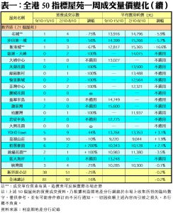 至於,九龍區21個指標屋苑上周累錄35宗二手買賣,按周增加6%,其中德福花園及都會駅各自錄得3宗成交,按周分別大增2倍;黃埔花園交投量則由前周的5宗,增加20%至上周的6宗。另外,在全港50個指標屋苑當中,上周共有19個屋苑錄得「零成交」,較前周的16個增近19%,當中港島區佔4個,九龍區及新界區則各佔7個及8個。(詳見表一)。