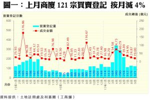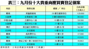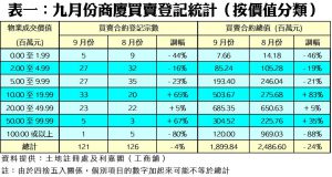 九月份商廈買賣登記量維持在約百二宗的水平窄幅徘徊,不少業主均表現惜售,令大額且優質的商廈交投進度緩慢。上月份商廈買賣合約總值持續回落,已連跌5個月,僅錄得近19億元,按月再跌24%,創過去7個月以來的低位。九月份最矚目的單一登記項目為觀塘東瀛遊廣場29樓全層連車位,涉及合約金額1.20億元;其次為九龍灣企業廣場3期8樓全層連車位,涉及登記金額為8,000萬元。