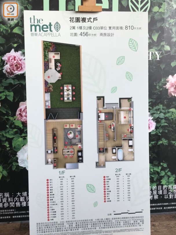 發展商今日首度展示2翼1及2樓C03室花園複式戶的平面圖,間隔兩房設計,實用面積810方呎,花園面積456方呎。
