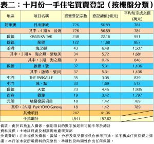 展望十一月份,陳海潮指出,新盤將持續魚貫登場,買賣登記量料至少可維持與十月份相若甚至更高的水平;而第四季餘下這兩個月,只要按月能保持在逾1,600宗的登記,則全年一手買賣登記量將趨向兩萬宗的水平,幾近肯定是近十年來最多;至於登記金額方面,預期全年有力突破2,300億元水平,繼續刻下歷史新標記。