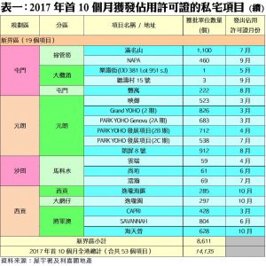 資料顯示,十月份本港共有4個私宅項目正式落成。當中規模較大的項目為將軍澳「海天晉」,項目涉及628伙;其次為西貢「逸瓏園」,涉及單位伙數297個;至於其餘項目包括西貢「逸瓏海匯」(285伙)及 (8伙)亦於期內竣工(詳見表一)。