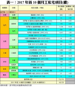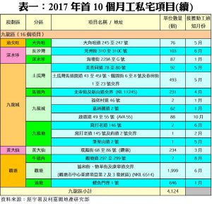 數據顯示,十月份共有6個私宅項目動工,涉及單位總數2,720伙,當中較大規模為大埔白石角創新路(TPTL 227),涉及1,408伙;其次,屯門第56區掃管笏路(TMTL 541) 亦於同月開展施工,涉及1,154伙。此外,九龍城AVA 55(88伙)、元朗尚悅.方(63伙)、大嶼山長沙(DD332 LOT 758)(6伙)及渣甸山軒德蓀道5號(1伙)亦於同月展開上蓋建築工序。而房協出租單位筲箕灣明華大廈重建計劃第一期(966伙)亦於同月動工,惟其並非私人住宅項目,故不計入私宅動工量。