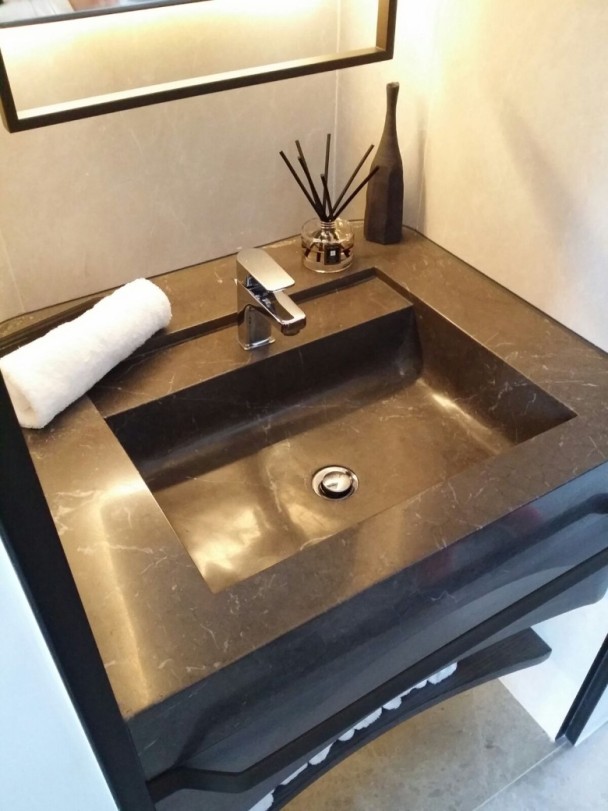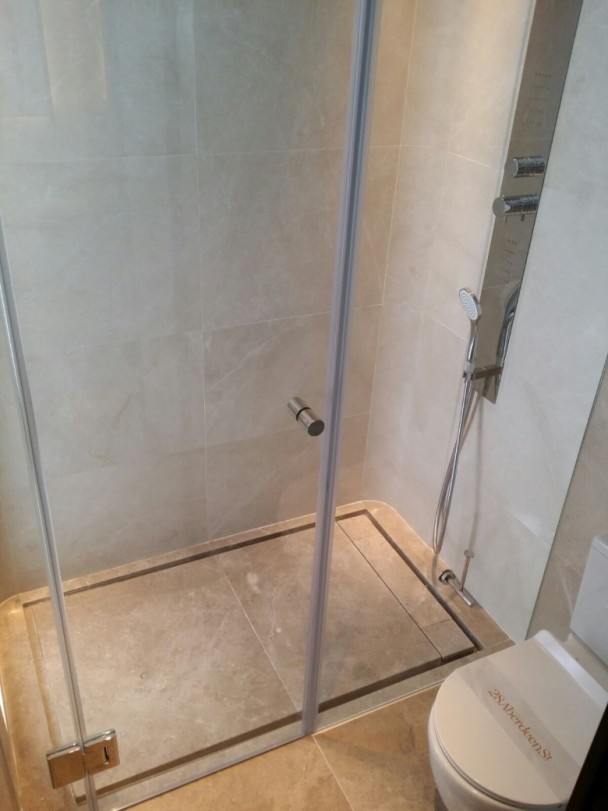 浴室採用大量天然石材,包括地台及牆身,洗手盤檯面由完整一塊雲石打造而成,非合成品。浴室亦裝設鏡櫃及木製櫃,以便住戶放置各式浴室用品。