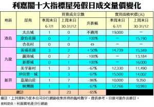 《利嘉閣十大指標屋苑假日二手實況》 二手元旦銷情暢旺過後 盤源大幅減少 十大屋苑周末錄8宗買賣 重落個位數