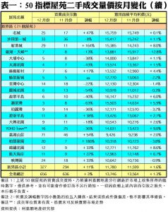 回顧全港三區樓價,十二月份九龍及新界區均錄得升幅,而港島區則按月回落。當中以九龍區的升幅最突出,21個指標屋苑上月的加權平均實用呎價按月升2.4%,報14,875元;新界區21個屋苑的平均實用呎價亦升1.6%,報11,780元。至於港島區則逆市下跌,8個屋苑的平均實用呎價跌1.7%,報16,575元。在上月的50指標屋苑當中,平均呎價在1.5萬元之上者共有28個,較前月的23個增多5個。