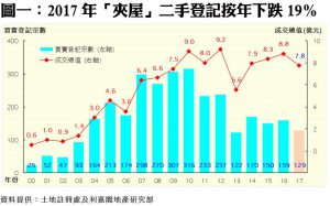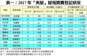 利嘉閣地產研究部指出,去年私宅新盤百花齊放,當中不乏細碼上車盤選擇,加上新居屋及多個資助房屋項目推出,夾屋客源顯見流失。根據土地註冊處資料顯示,2017年全港僅129宗夾屋二手買賣登記,較2016年的159宗下跌19%,創近四年新低;受惠樓價上升,期內物業成交總額按年跌幅較少,由2016年的8.83億元減少12%至去年的7.75億元。回顧去年12月份,全港夾屋二手買賣登記共有17宗,成交總值1.09億元,較11月份的17宗及1.10億元,分別按月持平及微跌1%。