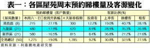 按地區劃分,全港三區的周末預約睇樓量全線下挫,當中以港島區跌幅最顯著,該區8個指標屋苑於周末暫錄215組客戶預約睇樓,按周下挫27.1%,未來4天則錄300組。利嘉閣嘉亨灣二行經理黃諾文表示,儘管最近股市大幅波動,但對區內業主來說影響不大,議價空間仍然較少,其中鯉景灣逸華閣高層A室的三房單位,成交價高達1,530萬元,平均成交實用呎價約19,125元,破屋苑成交價及呎價新高。黃諾文指出,現時屋苑放盤量少,買家追價入市的情況普遍,但新春長假期間預約睇樓客人較少,料需待農曆年初四或過後,交投方會開始復甦。