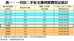 按物業區域劃分,新界區以99.1%之數繼續成為獲利成功比率最高的分區,並較去年十二月份微升0.1個百分點;港島及九龍區則分別達98.5%及99.0%,按月同告錄得升幅。按物業轉售價格分析,除了價格介乎300萬至500萬元以內單位之獲利比率錄得輕微跌幅外,其餘價格組別皆有升幅或持平,當中銀碼在300萬元以內者之獲利比率升幅最大,達1.9個百分點,由前月的91.6%增至上月的93.5%。至於轉售獲利比率最高者為價值介乎700萬至1,000萬元以內的組別,上月錄得99.6%,較去年十二月錄得的98.9%,增加0.7個百分點(見表一)。