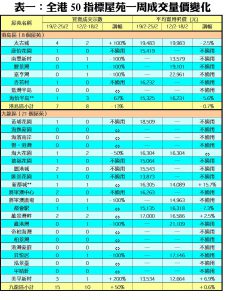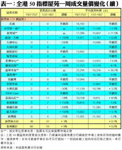 至於,港島區8個指標屋苑上周僅錄7宗交投,按周再減13%,當中海怡半島期內只得1宗買賣,較前周的3宗大減67%;而龍頭屋苑太古城則由前周的2宗成交,增加至上周的4宗,按周回升1倍;不過,南豐新村、鯉景灣、嘉亨灣及藍灣半島上周交投則暫時「捧蛋」。另外,在全港50個指標屋苑當中,上周共有20個屋苑錄得「零成交」,較前周的22個減少9%,當中港島區及新界區各佔4個及5個,九龍區則佔11個(詳見表一)。