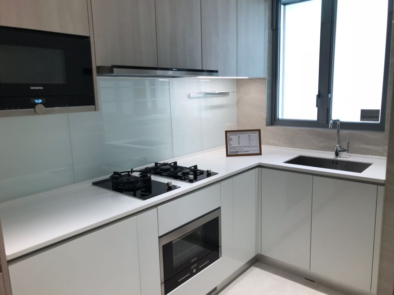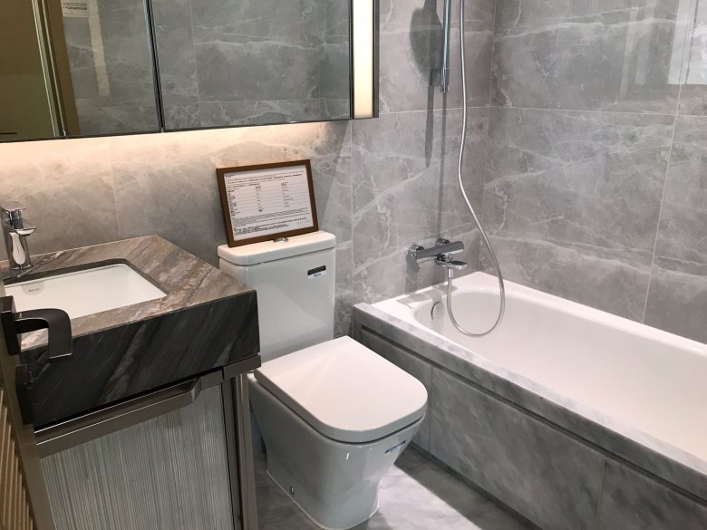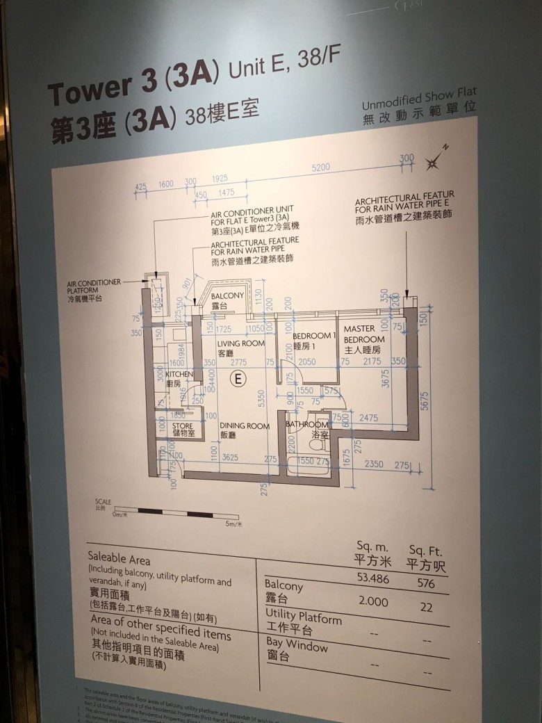 至於兩房連儲物室示範單位,參照第3A座38樓E室搭建,實用面積576方呎,大廳連接面積22方呎露台。
