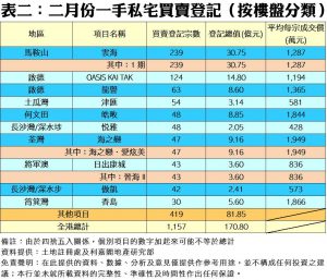 按樓盤分類,雲海以239宗之數成為二月份登記量最多的一手私宅項目,涉及登記總值達30.75億元,平均每宗登記約為1,287萬元。排第二、三位者分別是OASIS KAI TAK及龍譽,分別錄得124宗及63宗登記。至於登記排行榜內上月平均每宗買賣成交價最高者為海之戀‧愛炫美的約1,949萬元,而較低平均成交價的一手項目則為悅雅的約428萬元。
