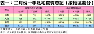 至於新界區方面,表現亦見理想,出現量值同步上升之況,主要受惠全新盤雲海開售的理想反應,在首輪及次輪推售均即日清袋下,上月累錄逾二百宗,刺激整個新界區二月份的一手私宅共錄得542宗,按月升37%;而登記金額錄69.96億元,亦升42%。