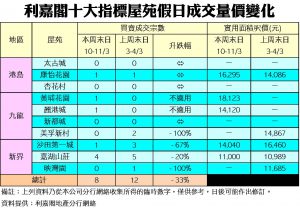 《利嘉閣十大指標屋苑假日二手實況》 焦點新盤熱銷搶客源 二手價高交投回落 十大指標屋苑周末錄8宗買賣 按周減逾三成