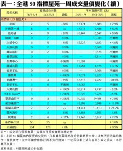 至於,港島區8個指標屋苑上周錄得18宗買賣,按周減少31%,其中南豐新村上周僅得1宗成交,較前周的4宗大減75%;康怡花園則錄得4宗買賣,按周回落33%;龍頭屋苑太古城買賣由前周的9宗略減至8宗,按周再減11%。另外,在全港50個指標屋苑當中,上周共有10個屋苑錄得「零成交」,較前周的8個增加25%,當中港島區及九龍區各佔2個及3個,新界區則佔5個(詳見表一)。