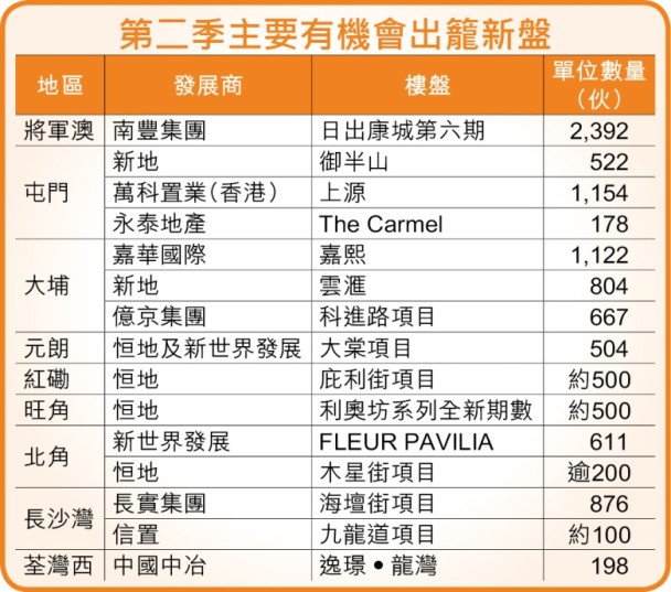 樓價升勢未止,發展商趕趁銀行加息前全速推盤,第二季勢爆發大規模開盤搶客潮。根據統計,本季有機會多達20個新盤出籠,合共提供逾1萬伙,較首季新盤銷量多逾1.6倍,當中市區及新界盤源同樣充裕,市場競爭料轉趨激烈。