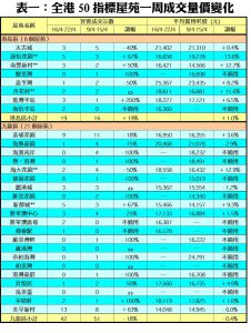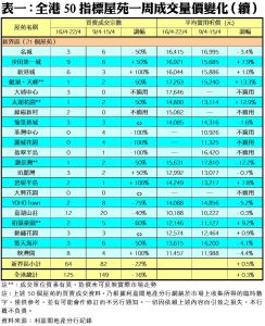 至於港島區8個指標屋苑上周累錄19宗買賣,按周增加19%,其中藍灣半島成交由前周的1宗,大增2倍至上周的3宗;康怡花園及南豐新村上周各自錄得5宗及3宗成交,分別較前周增加67%及50%;龍頭屋苑太古城的買賣,則由前周的5宗減至上周的3宗,按周減少40%。另外,在全港50個指標屋苑當中,上周共有15個屋苑錄得「零成交」,較前周的9個增加67%,當中港島區佔1個,九龍區及新界區則各佔10個及4個(詳見表一)。