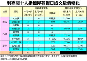 《利嘉閣十大指標屋苑假日二手實況》 二手新高成焦點 買家追價入市 十大屋苑周末錄17宗買賣 較上周升42%
