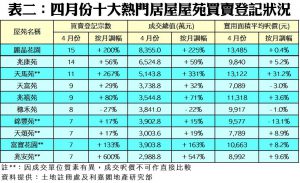 樓價飛升,四月份每宗二手居屋平均成交價再創歷史新高,高見502.9萬元,按月再漲1.6%,今年更累升9.9%。而在上月的登記當中,以筲箕灣東霖苑高層4室的成交價最高,單位實用面積603平方呎,以高達818萬元易主,平均實用呎價約13,566元。若以實用呎價計算,則以鰂魚涌康山花園7座高層A室最矚目,單位實用面積431平方呎,以788萬元易手,平均實用呎價高見約18,283元,媲美區內私樓呎價。