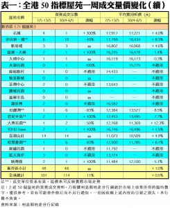 至於,港島區8個指標屋苑上周累錄13宗買賣,按周增加1宗或8%,其中杏花村連錄6宗交投,較前周的1宗大增5倍;太古城的成交量則由前周的8宗,減少63%至上周的3宗;而南豐新村、鯉景灣、嘉亨灣及藍灣半島上周分別錄得1宗交投。另外,在全港50個指標屋苑當中,上周共有9個屋苑錄得「零成交」,較前周的14個減少36%,當中港島及九龍區各佔2個及3個,新界區則佔4個 (詳見表一)。