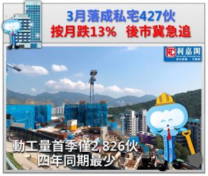 三月份427伙私宅竣工 按月減少13% 大型項目欠奉 首季落成量僅佔預測7%