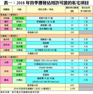 資料顯示,三月份本港共有6個私宅項目正式落成。當中包括九肚山「澐灃」,項目涉及158個單位;其次為長沙灣「尚都」,涉及單位伙數157個;至於其餘項目包括北角康福臺3號(37伙)、九龍城太子道西420至422號(33伙)、洪水橋丹桂村項目﹙DD 124 Lot 4303)(24伙)及旺角煙廠街4號(18伙)(詳見表一)。