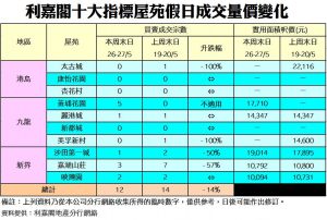 利嘉閣地產總裁廖偉強表示,啟德地王誕生後,市場氣氛保持熾熱,惟無奈二手屋苑盤源不足,成交量難有突破性發展。綜合利嘉閣地產分行網絡數據,在過去的周末日(5月26至5月27日)十大指標屋苑累錄12宗二手買賣個案,較上周末(5月19至5月20日)的14宗減少2宗或14%,交投保持平穩。
