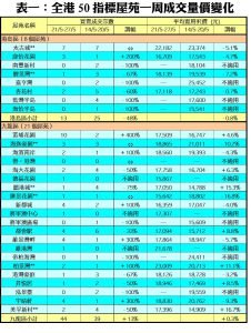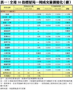 至於,九龍區21個指標屋苑上周共錄44宗交投,按周增加13%,其中黃埔花園連錄10宗買賣,較前周的2宗大增4倍;維景灣畔及宇晴軒交投量按周各自增加3倍,分別錄得4宗成交;海濱南岸、新都城及柏景灣則分別有2宗、4宗及2宗交投,按周增幅各達1倍。另外,在全港50個指標屋苑當中,上周共有11個屋苑錄得「零成交」,較前周的7個增加57%,當中港島及九龍區各佔4個,新界區屋苑則佔3個(詳見表一)。