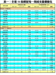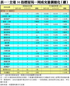 至於,新界區21個指標屋苑上周累錄59宗買賣,按周減少5%,其中新港城期內僅得1宗買賣,較前周的5宗大減80%;盈翠半島、錦繡花園及藍天海岸則各錄1宗、2宗及3宗成交,按周減幅分別有50%;名城成交量由前周的6宗,減少33%至上周的4宗;熱門上車屋苑嘉湖山莊上周則連錄13宗買賣,逆市增加63%。另外,在全港50個指標屋苑當中,上周共有12個屋苑錄得「零成交」,較前周的9個增加33%,當中港島及新界區各佔2個,九龍區則佔8個(詳見表一)。