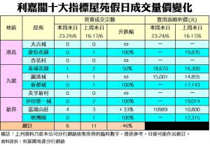 《利嘉閣十大指標屋苑假日二手實況》 市場缺乏利好消息刺激 二手交投回落單位數 十大屋苑周末錄6宗買賣 較上周大跌46%