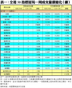 至於,九龍區21個指標屋苑上周累錄45宗交投,按周增加15%,其中淘大花園連錄5宗買賣,較前周的1宗大增4倍;維景灣畔交投由前周的1宗,增加1倍至上周的2宗;麗港城及新都城則各自錄得9宗及5宗成交,按周分別增加50%及67%。另外,在全港50個指標屋苑當中,上周共有13個屋苑錄得「零成交」,較前周的9個增加44%,當中港島佔2個,九龍及新界區則各佔5個及6個(詳見表一)。