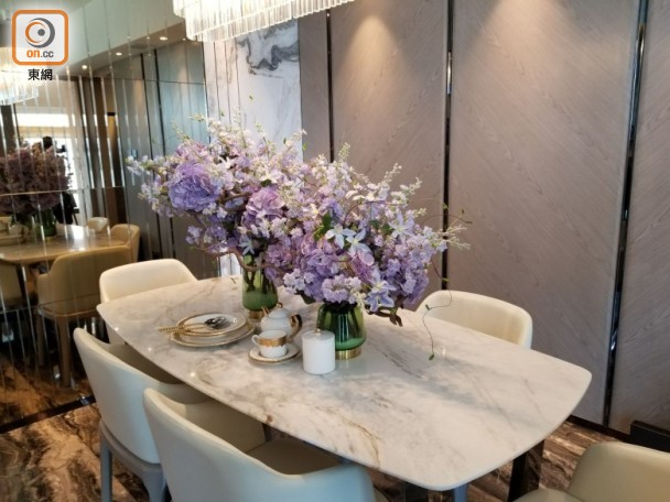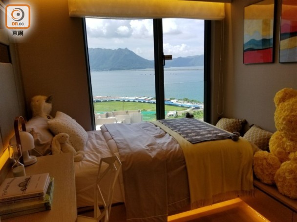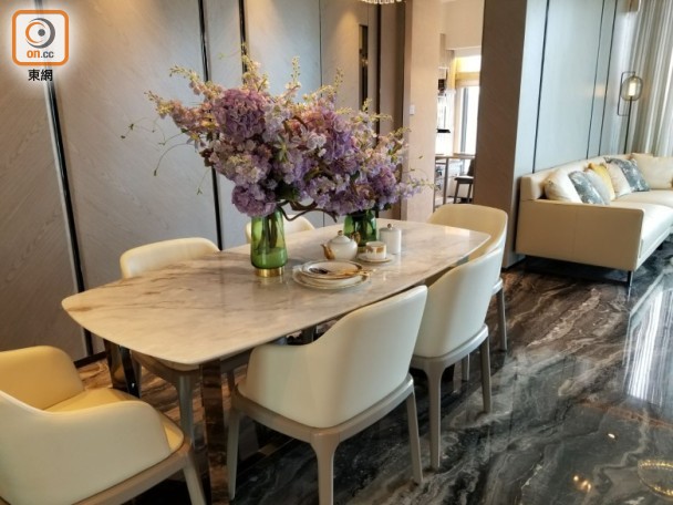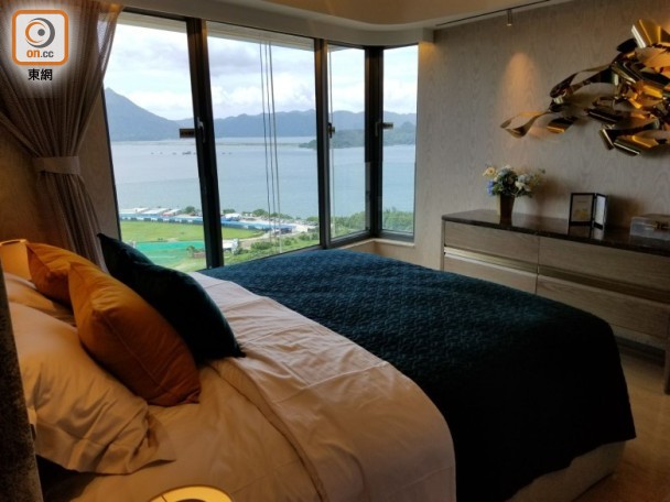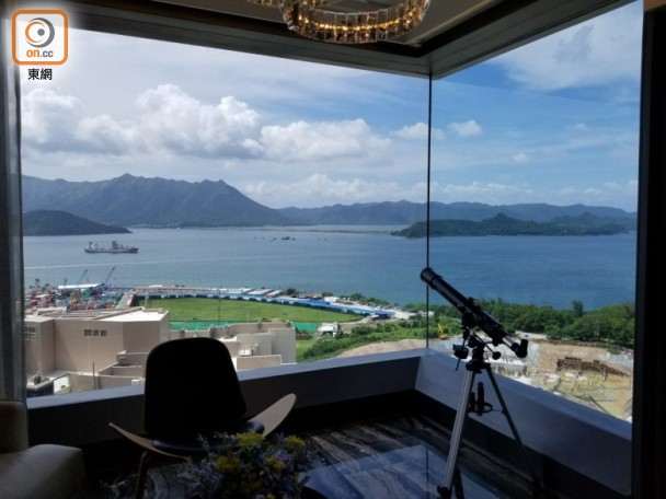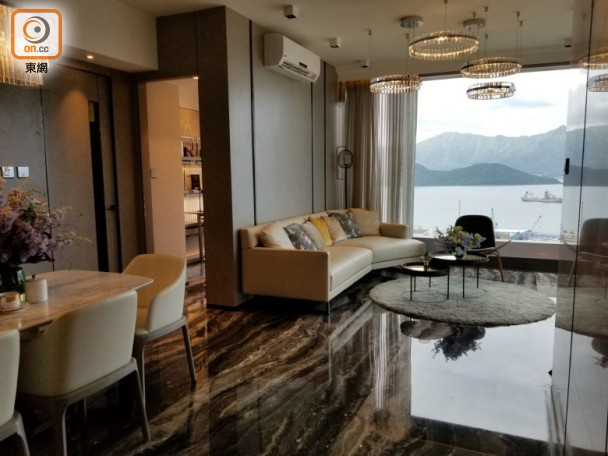 該盤周一(16日)開放2A座21樓D室連裝修示範單位,實用面積1,154方呎,大廳連接43方呎露台,採四房連套房間隔,客廳望向海星灣。