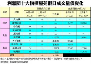 《利嘉閣十大指標屋苑假日二手實況》 市場氣氛持續觀望 二手交投低位徘徊 十大屋苑周末錄7宗成交 按周反彈75%