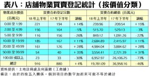 按物業價格分析,在七個價格組別的店舖物業交投量當中,錄得升幅的組別較多,其中5,000萬至1億元以內的大銀碼店舖登記量升幅最顯著,上半年共錄54宗,按半年大升35%;而銀碼介乎1,000萬至5,000萬元以內的兩個組別亦分別升11%及28%(見附錄表八),反映過去半年中價至中高價店舖買賣有所轉旺。至於1億元或以上的大額店舖買賣登記方面,上半年出現顯著回落,僅錄得23宗登記,較去年下半年有領展出售多個商場而撐起的33宗,大減30%,亦是導致該組別相關登記金額出現急挫73%的主因。