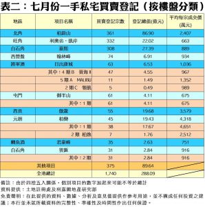 港島區上月表現理想,以登記量計更勝九龍區,七月份共錄得518宗一手私宅買賣登記,較六月的292宗按月大升77%,當中主要受惠北角柏蔚山熱賣而錄得的361宗登記所帶動,其次同屬東區的鰂魚涌君豪峰亦錄得35宗登記。至於期內涉及登記金額升幅更為可觀,錄得117.99億元,按月大增1.23倍,主要受柏蔚山平均每宗逾二千萬元的登記所帶動(見表二)。