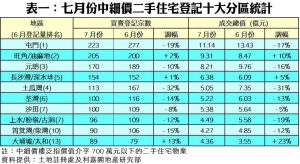 以十大活躍成交地區作分析,因應目前中細價物業買少見少,上月十個中細價二手住宅買賣登記量最旺的地區之中,有7個錄得跌幅,當中榜首常客屯門區,全月僅錄得223宗登記,雖蟬聯冠軍寶座,卻較前月的277宗急跌19%。而另一中細價樓熱門地土瓜灣則成為跌幅最大的分區,上月錄得113宗登記,按月大瀉32%(詳見表一)。
